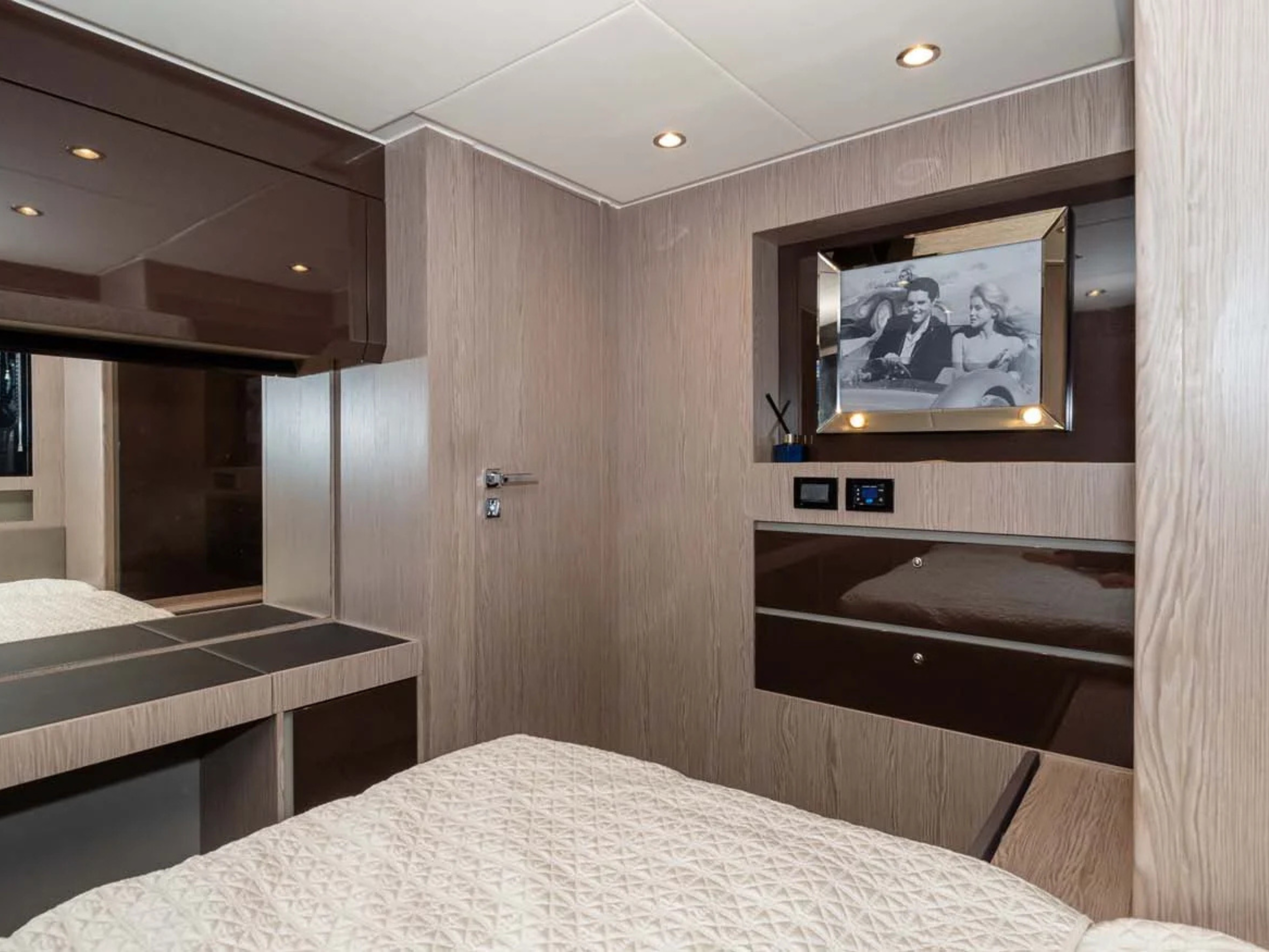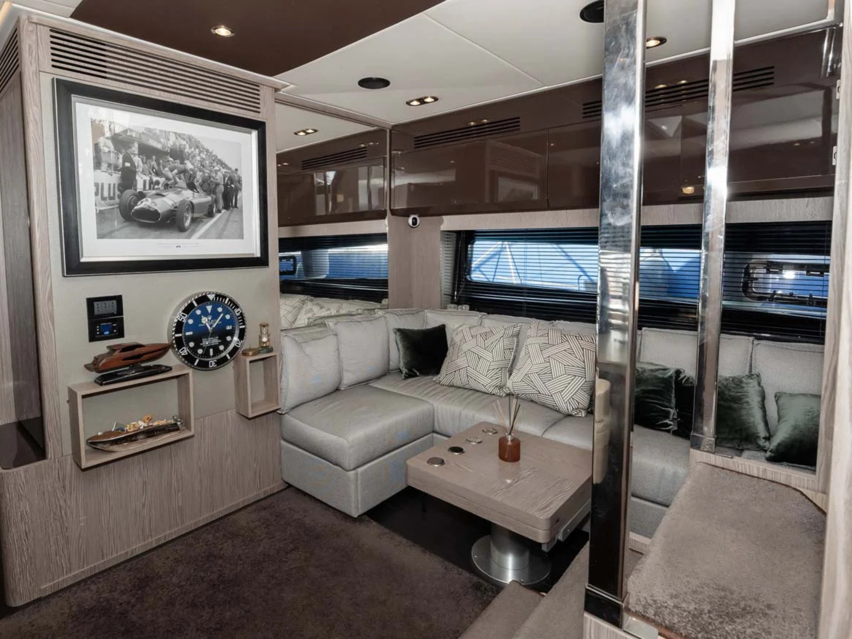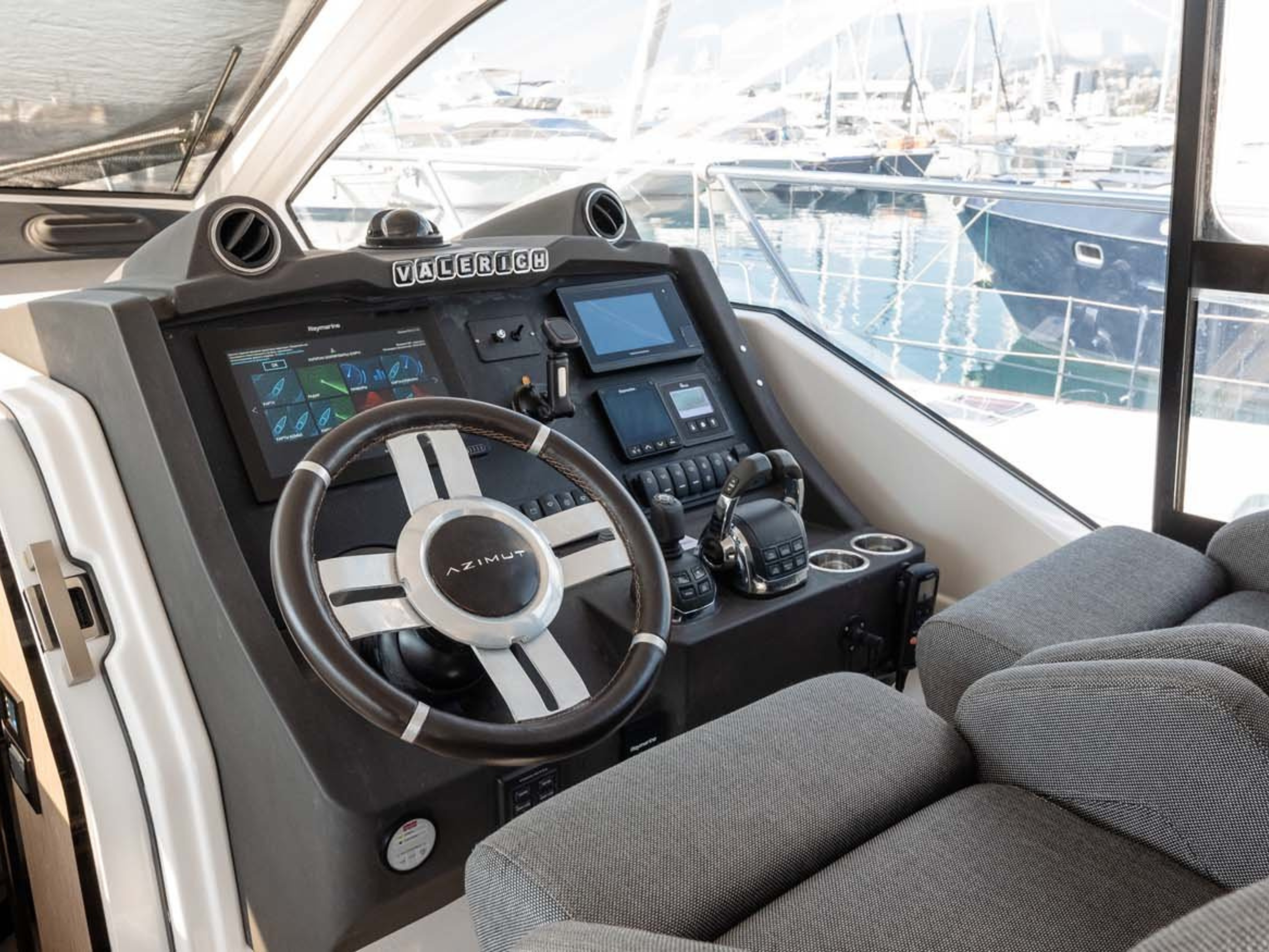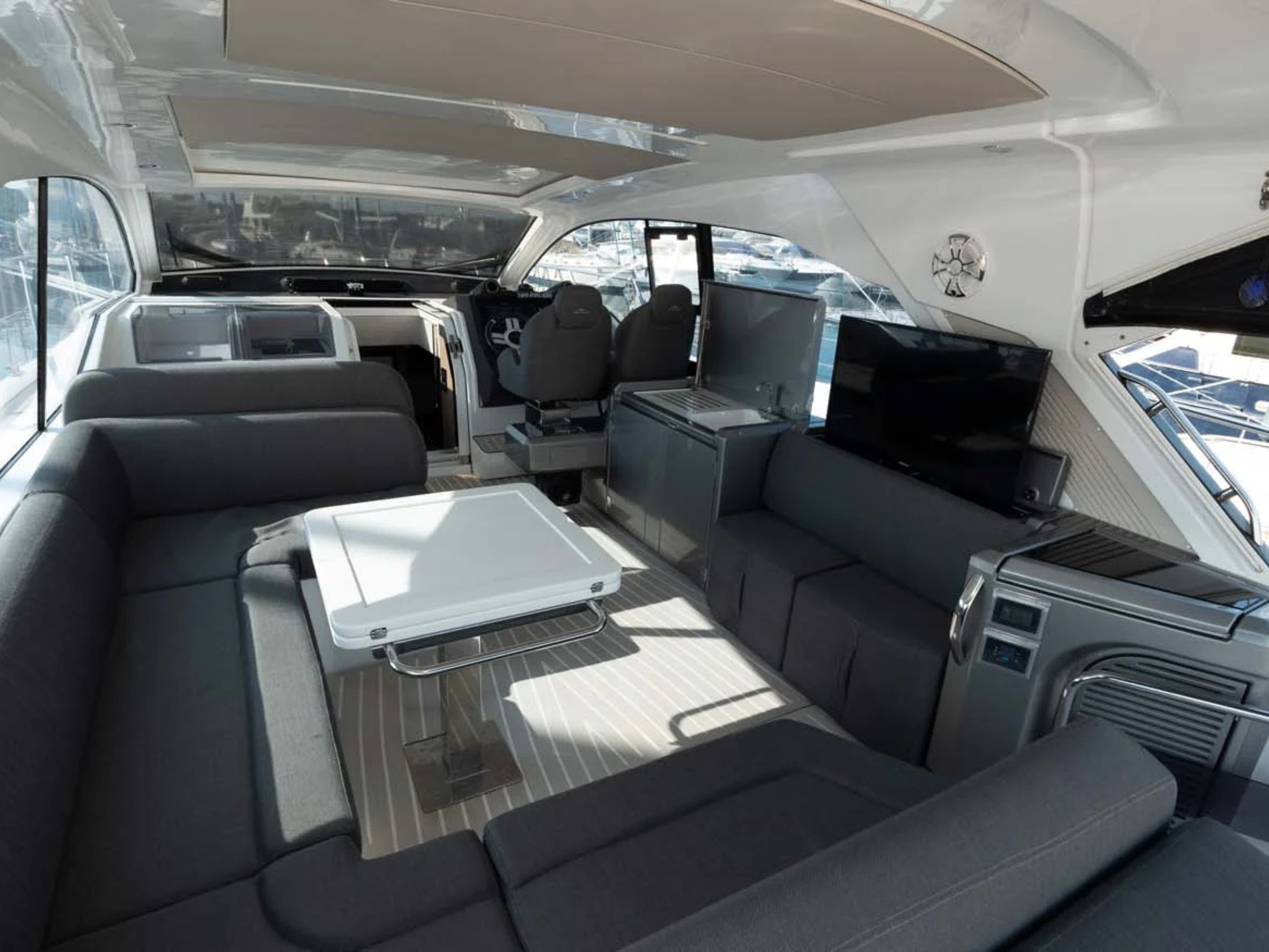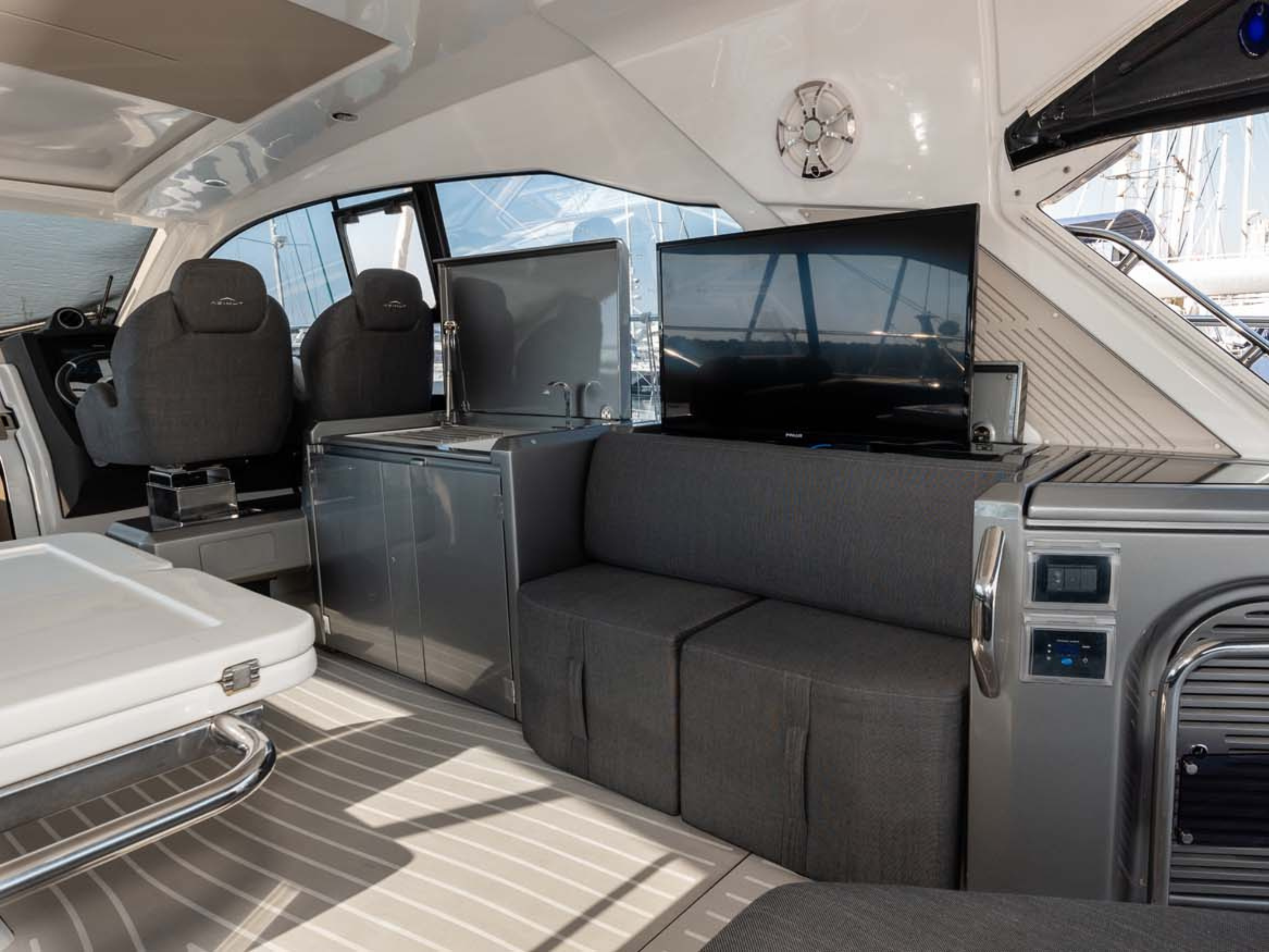 The yacht’s thoughtfully designed cockpit area is ideal for entertaining, featuring amenities like a folding barbecue on the swim platform, perfect for relaxed gatherings and dining alfresco. Additional standout features include a bow thruster for easy maneuvering, a powerful 60,000 BTU air conditioning system, advanced Raymarine navigation equipment, and underwater lighting.