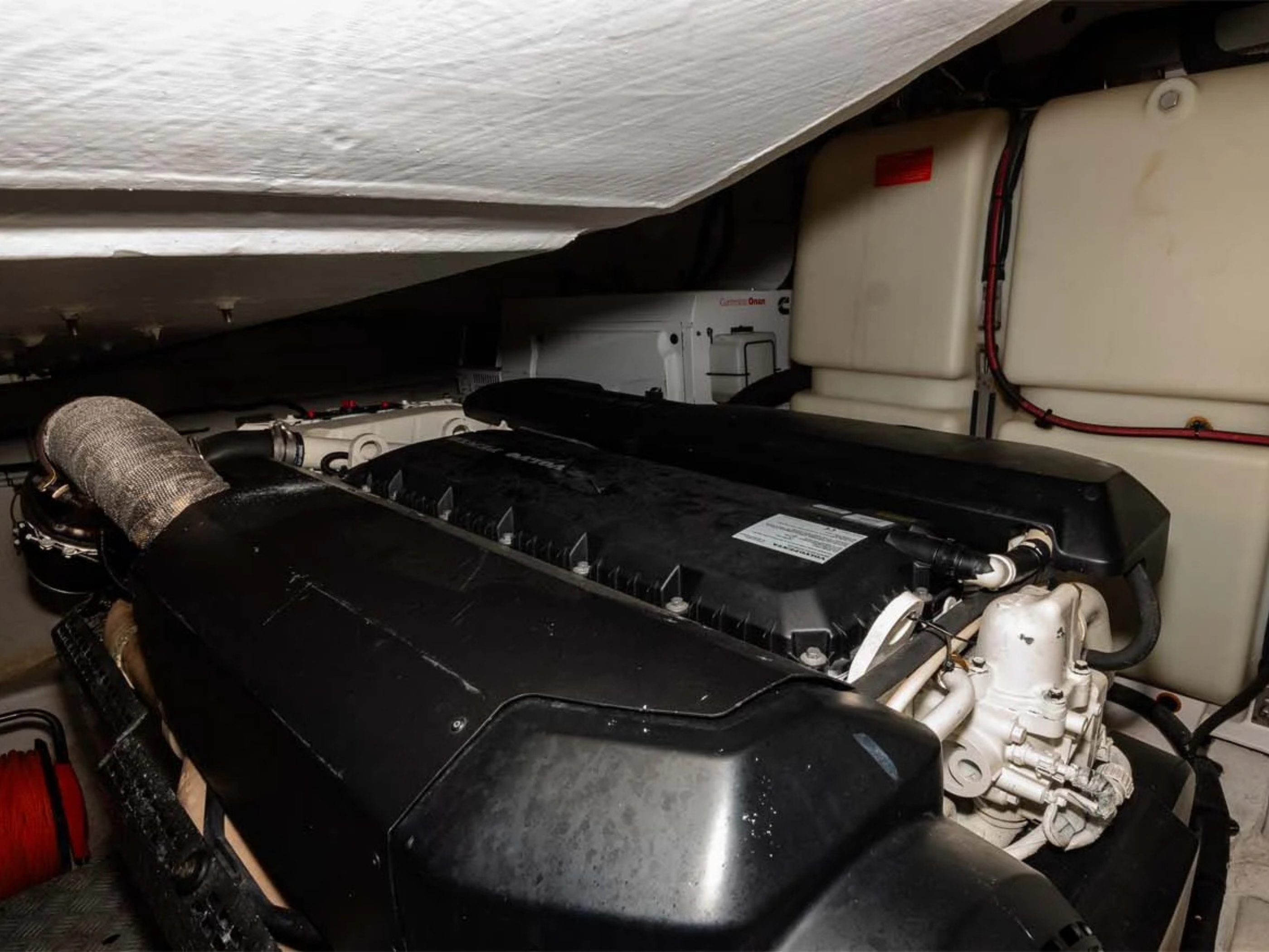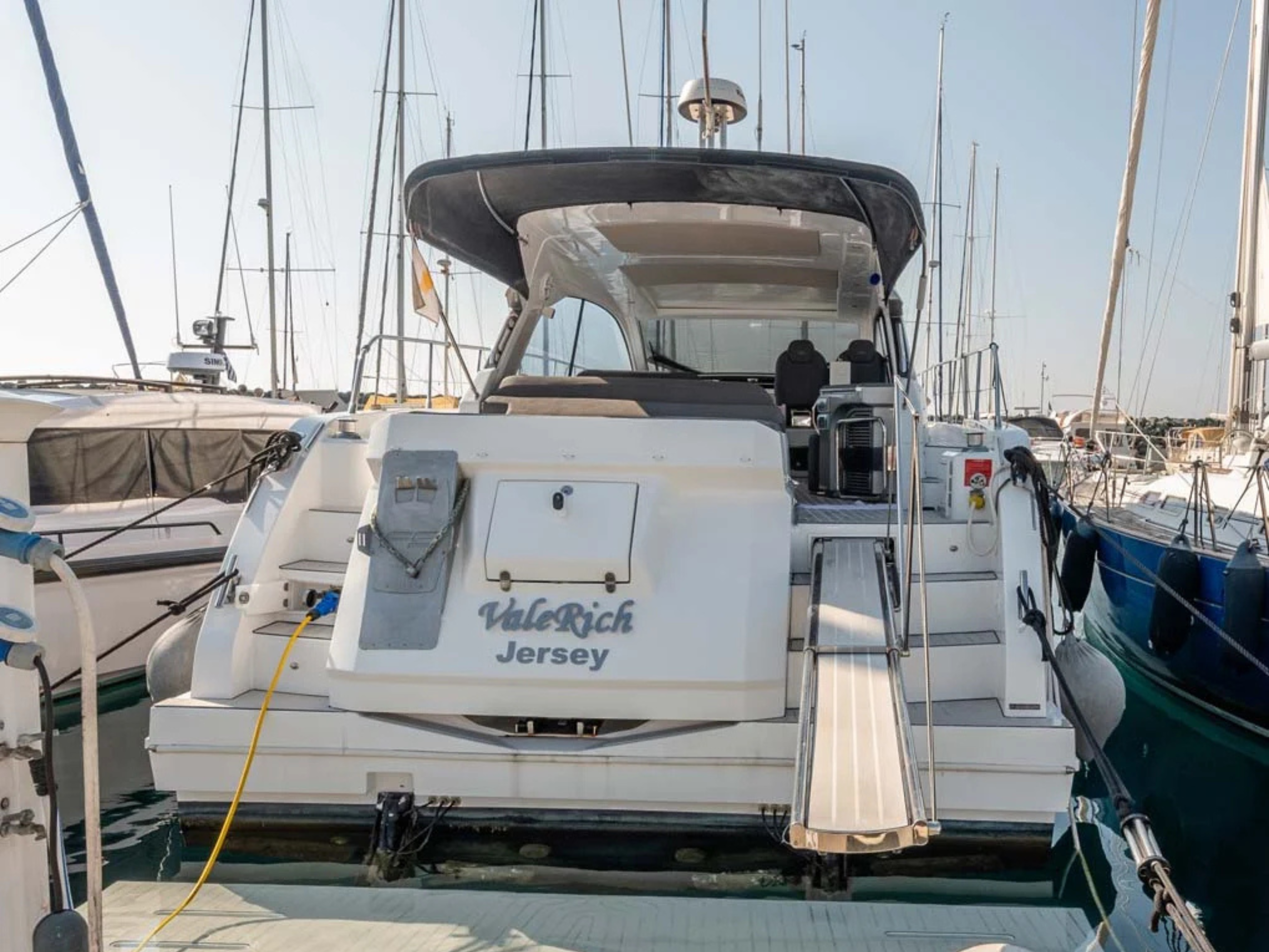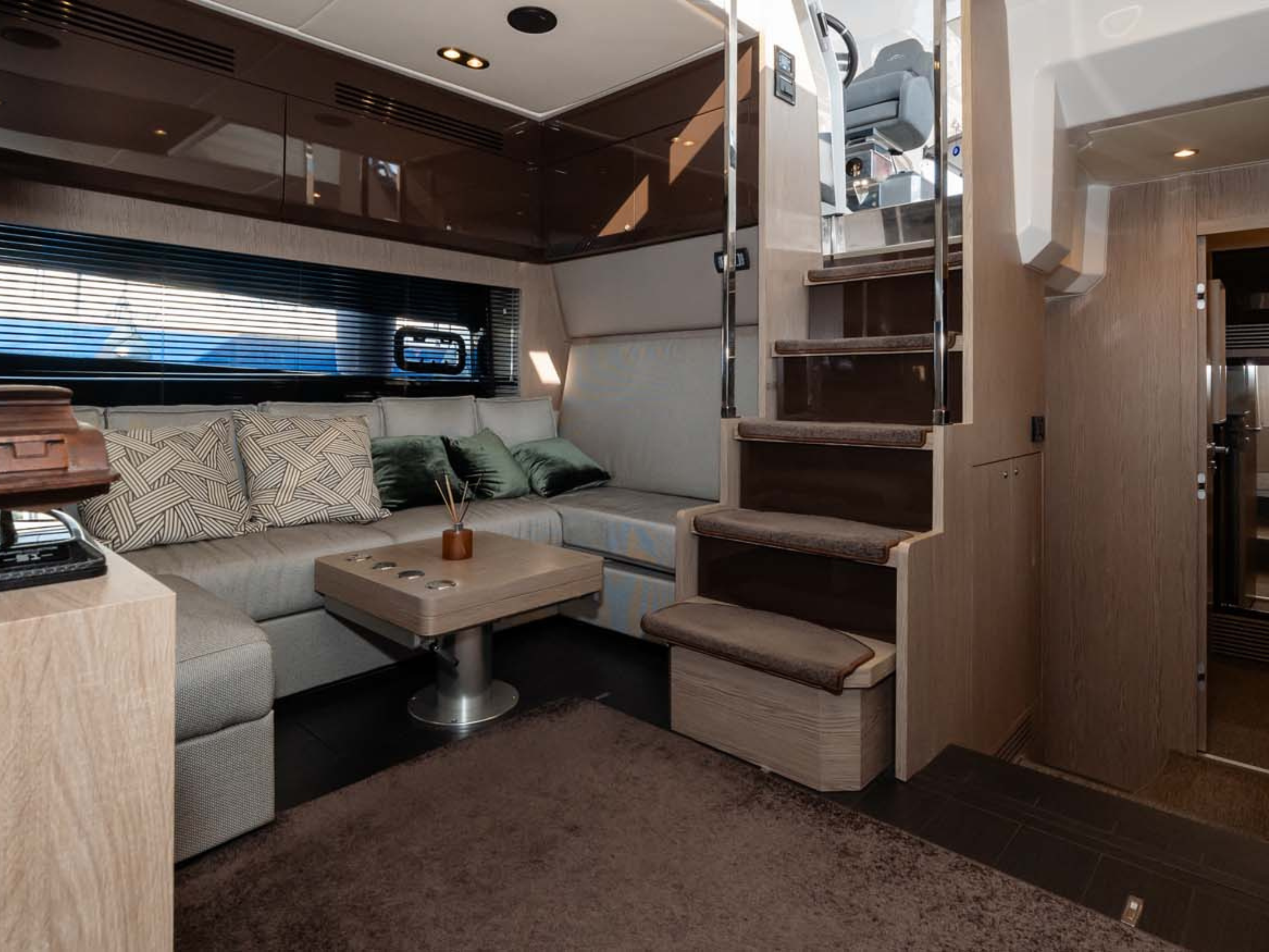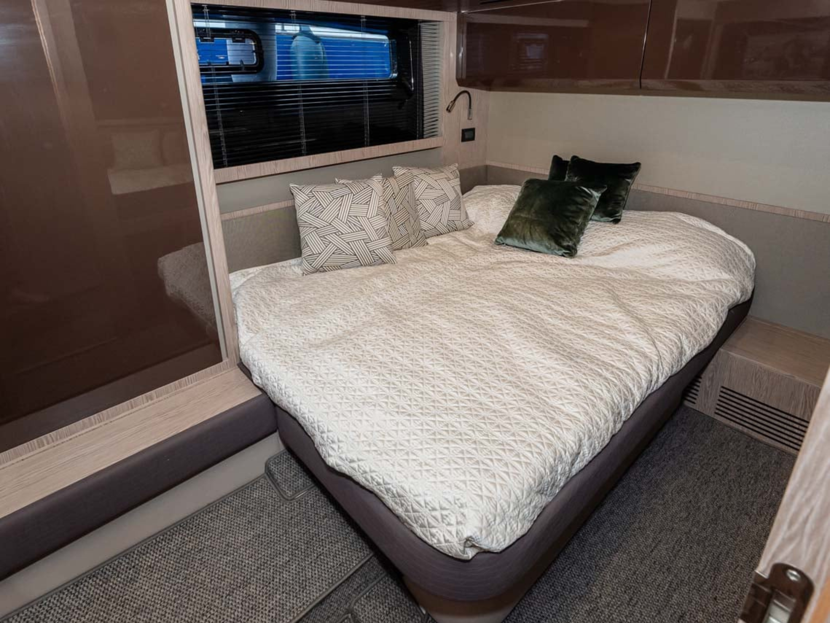 The yacht’s thoughtfully designed cockpit area is ideal for entertaining, featuring amenities like a folding barbecue on the swim platform, perfect for relaxed gatherings and dining alfresco. Additional standout features include a bow thruster for easy maneuvering, a powerful 60,000 BTU air conditioning system, advanced Raymarine navigation equipment, and underwater lighting.