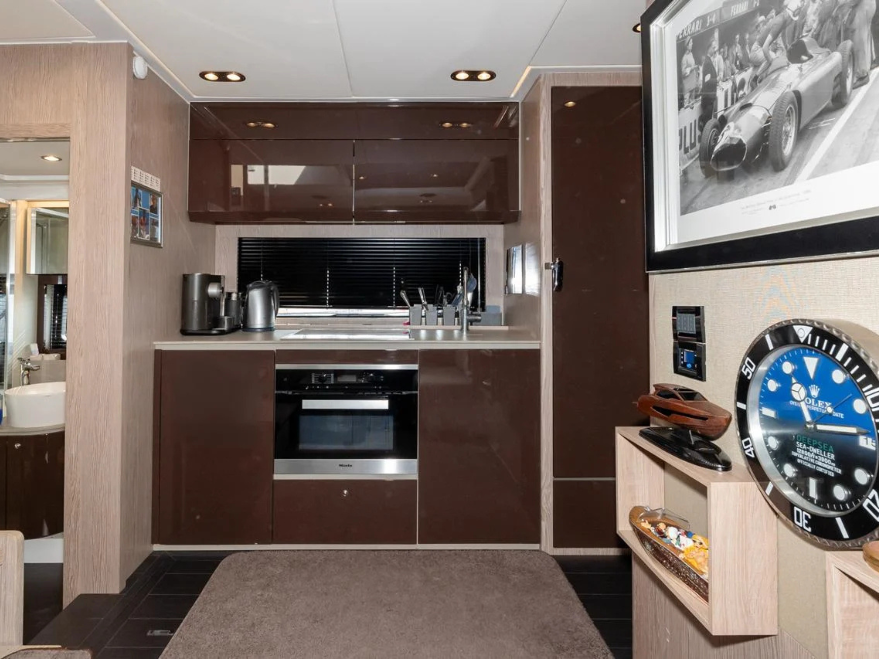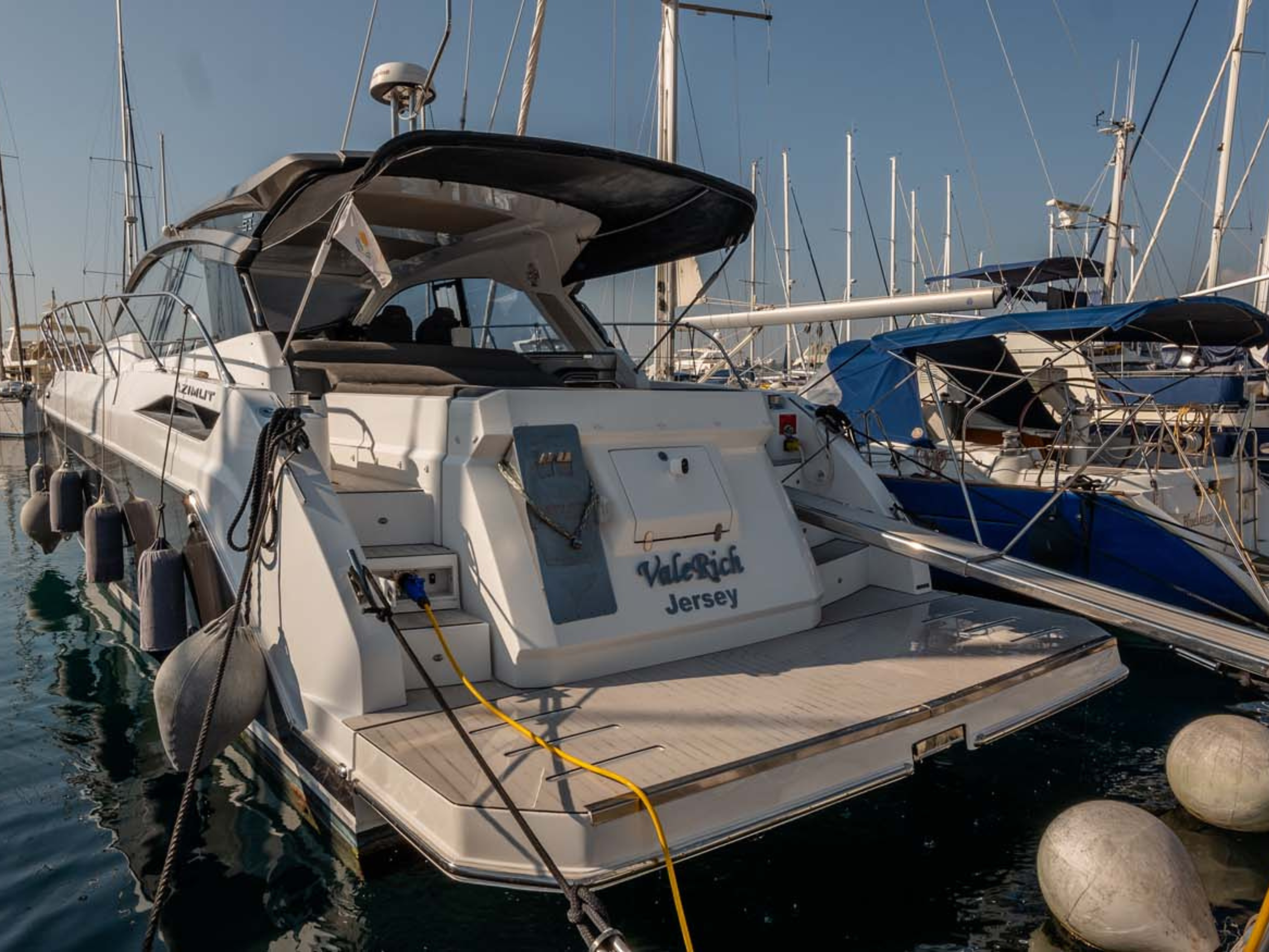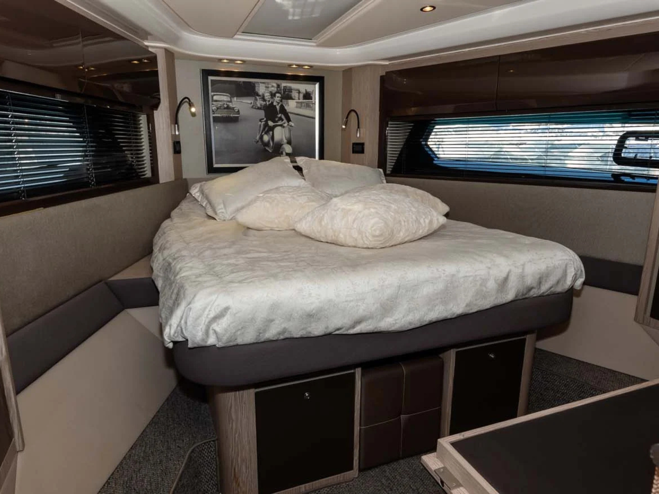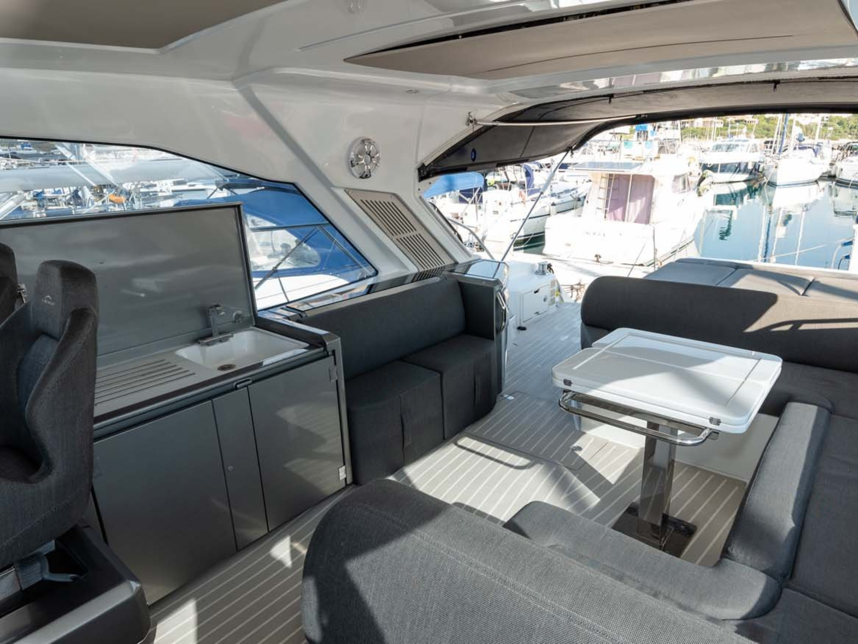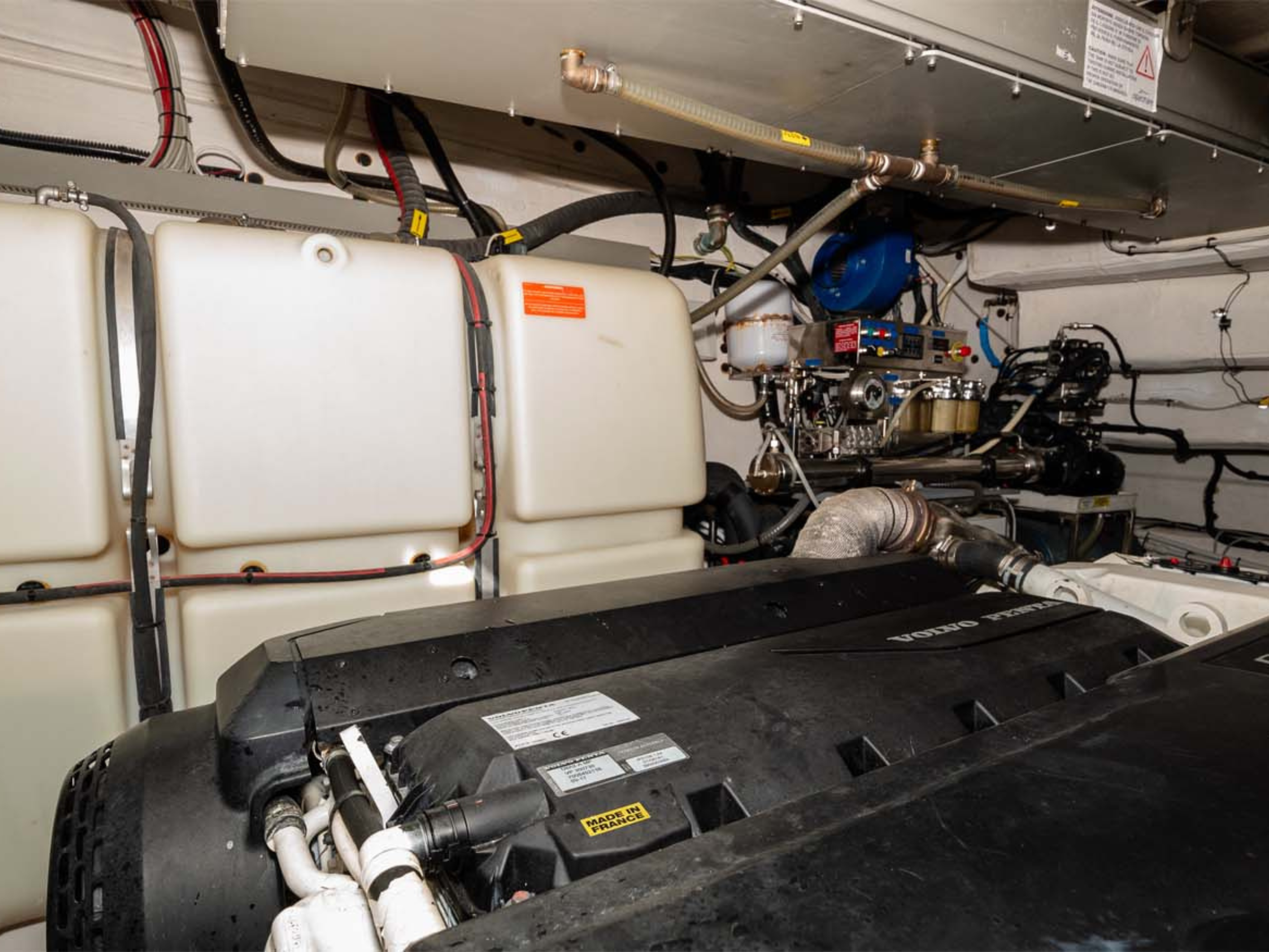 The yacht’s thoughtfully designed cockpit area is ideal for entertaining, featuring amenities like a folding barbecue on the swim platform, perfect for relaxed gatherings and dining alfresco. Additional standout features include a bow thruster for easy maneuvering, a powerful 60,000 BTU air conditioning system, advanced Raymarine navigation equipment, and underwater lighting.