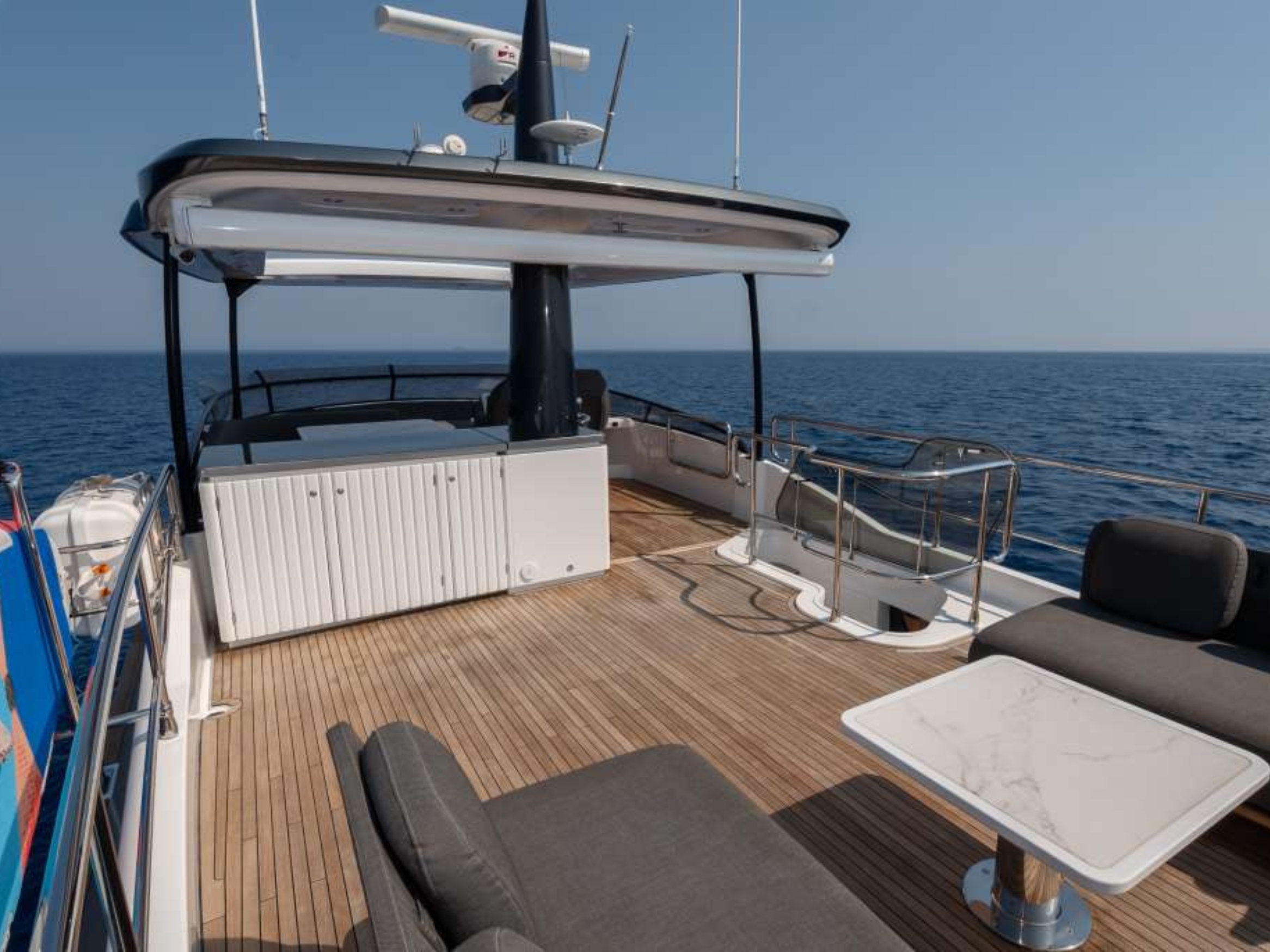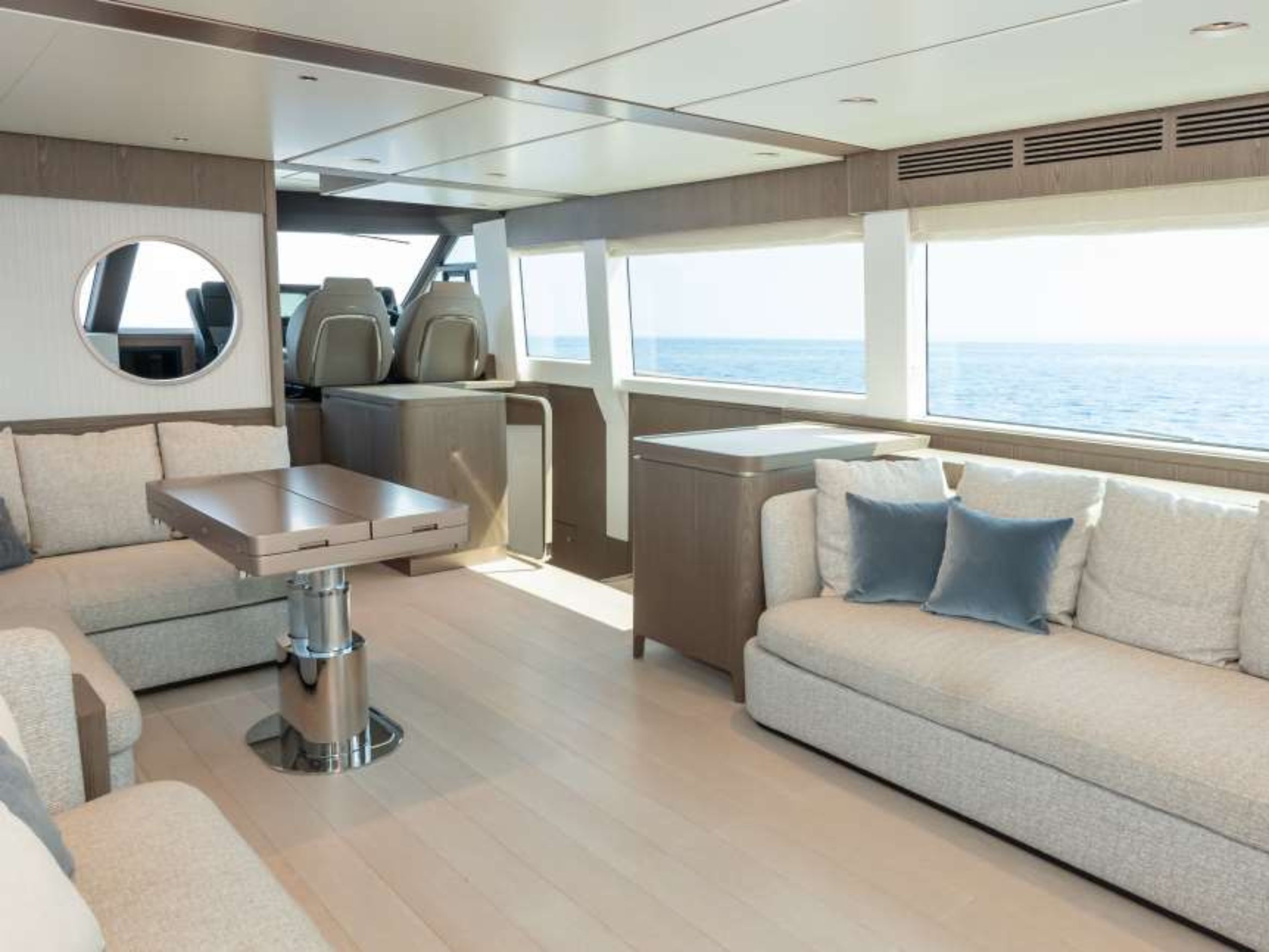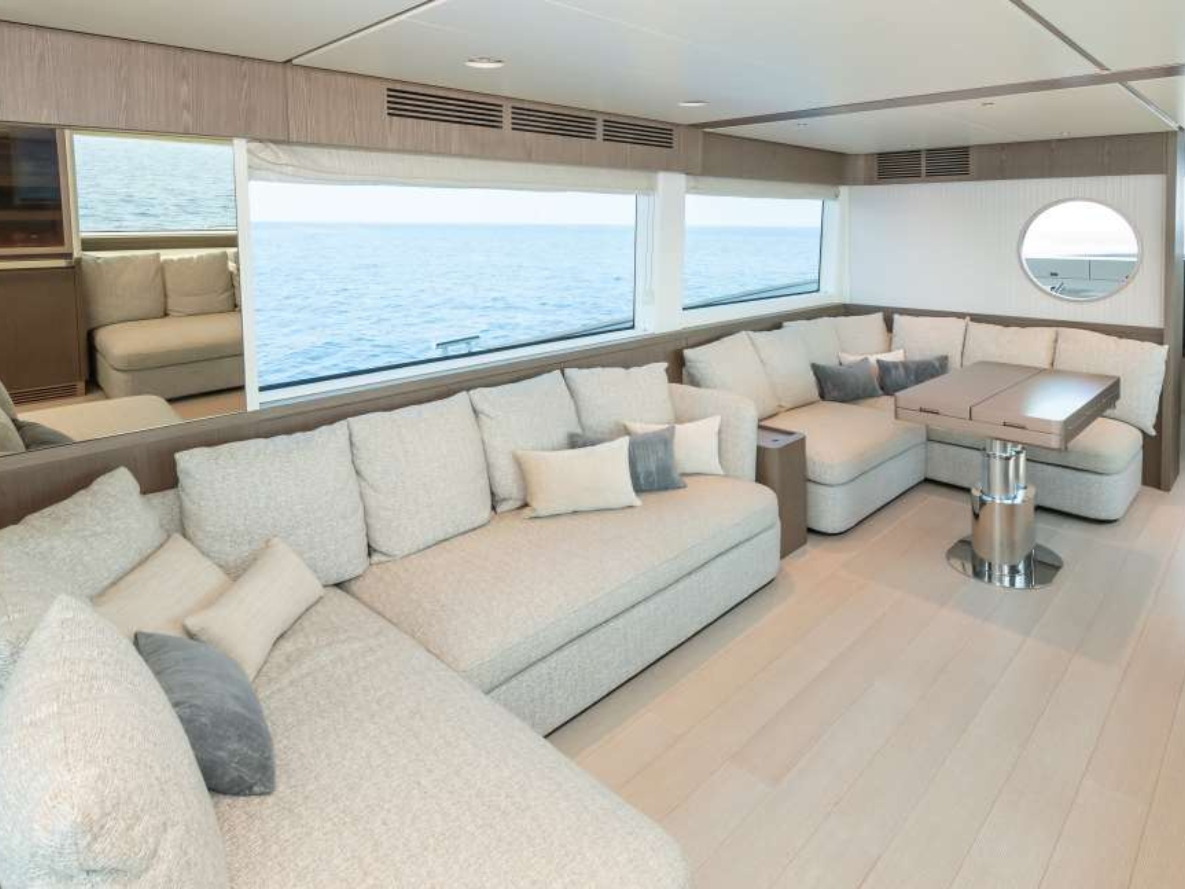 Notable features include a Seakeeper NG16 stabilizer, 92,000BTU air-conditioning, and a stylish Zante Grey hull. The elegant interior boasts Calacatta surfaces, Miele kitchen appliances, a wine cooler, and luxurious fabrics throughout. Advanced technology onboard includes the Raymarine navigation suite, SMART audio-video entertainment, and additional conveniences like a telescopic gangway, washer-dryer, and underwater lighting.