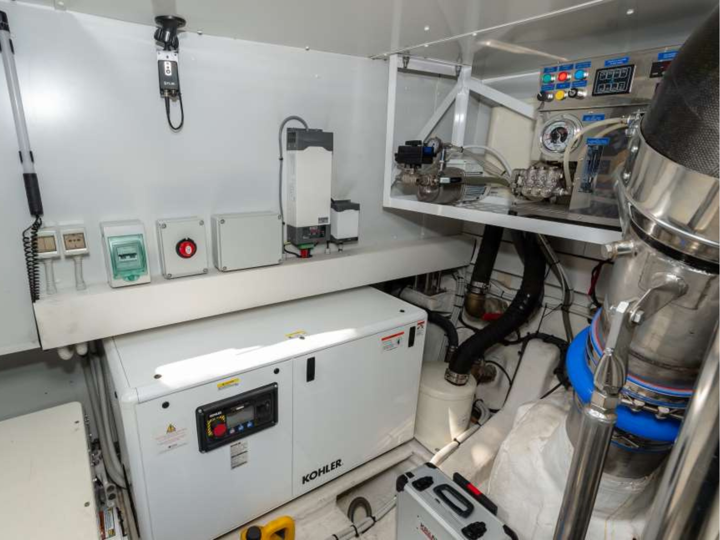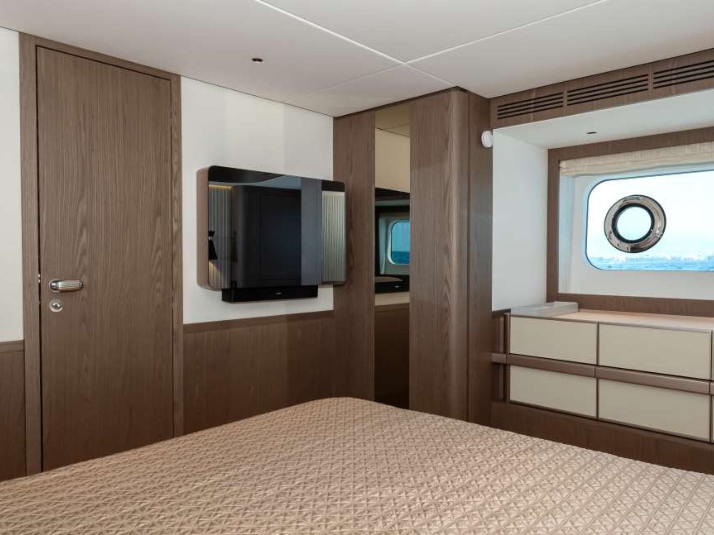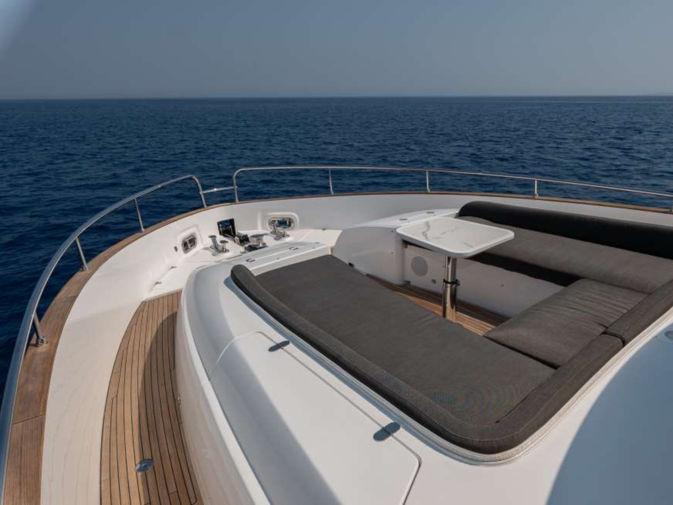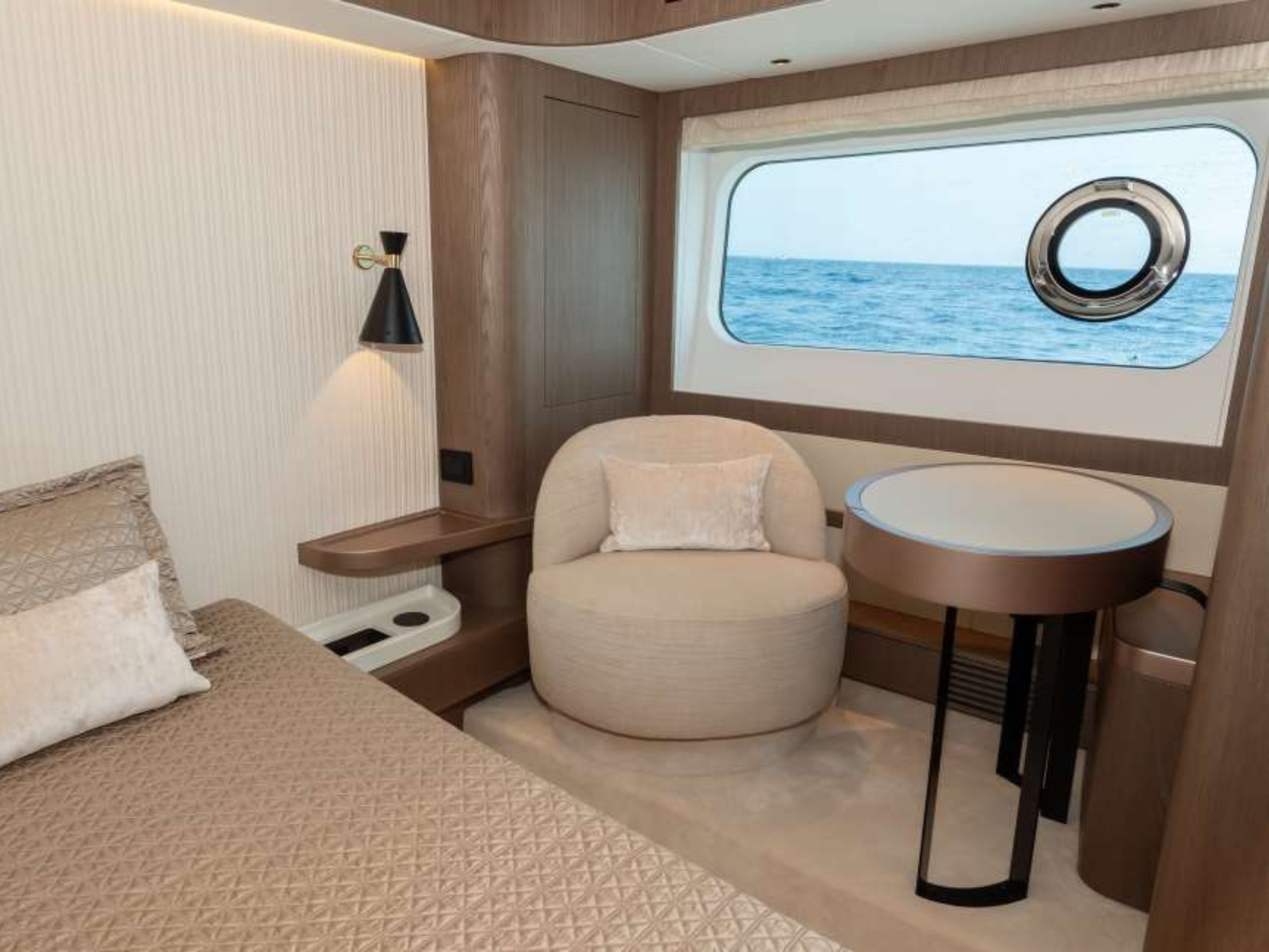 Notable features include a Seakeeper NG16 stabilizer, 92,000BTU air-conditioning, and a stylish Zante Grey hull. The elegant interior boasts Calacatta surfaces, Miele kitchen appliances, a wine cooler, and luxurious fabrics throughout. Advanced technology onboard includes the Raymarine navigation suite, SMART audio-video entertainment, and additional conveniences like a telescopic gangway, washer-dryer, and underwater lighting.