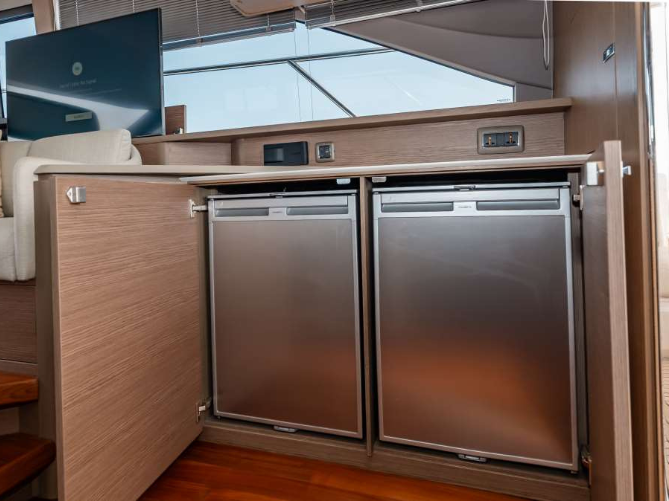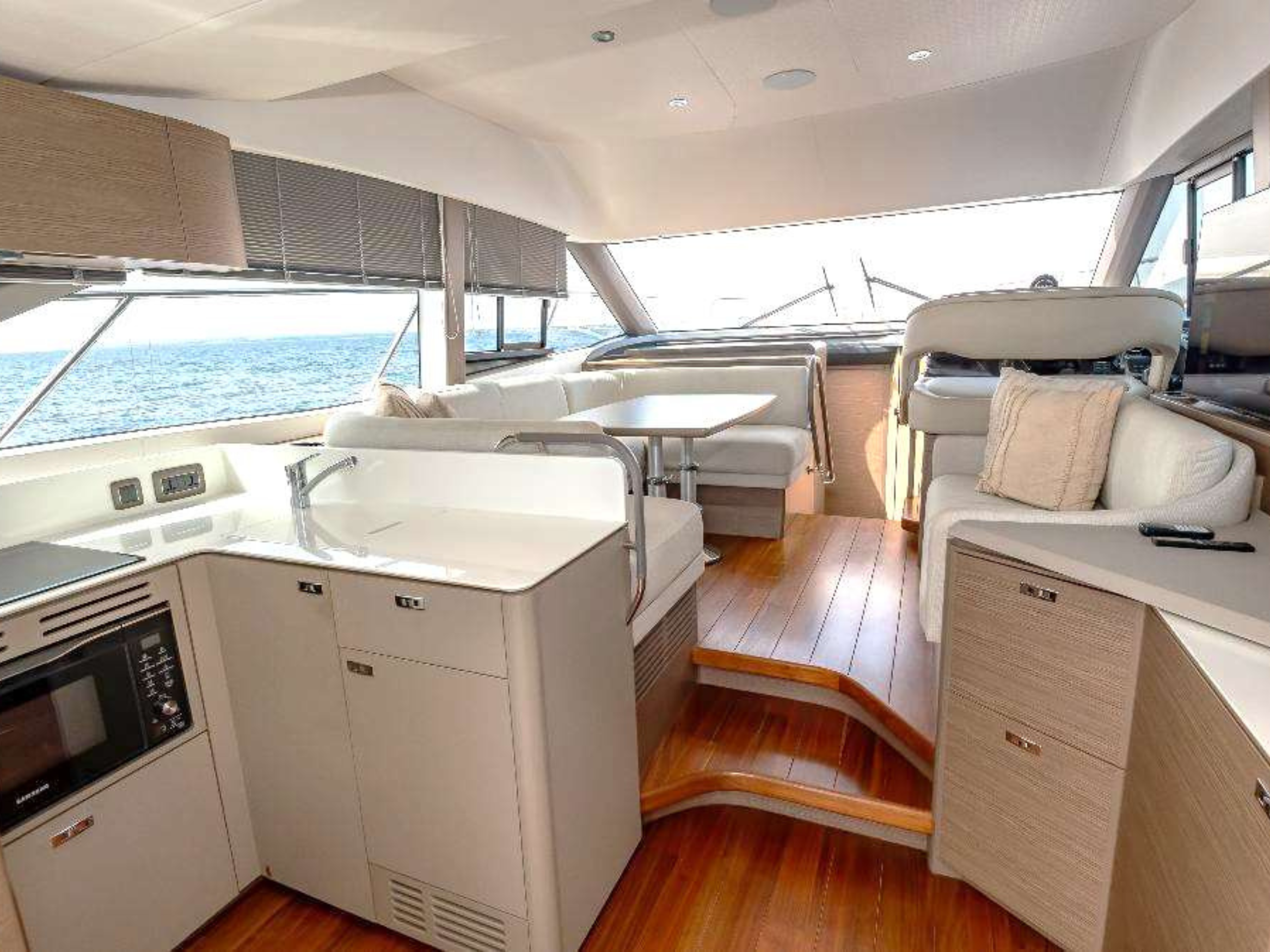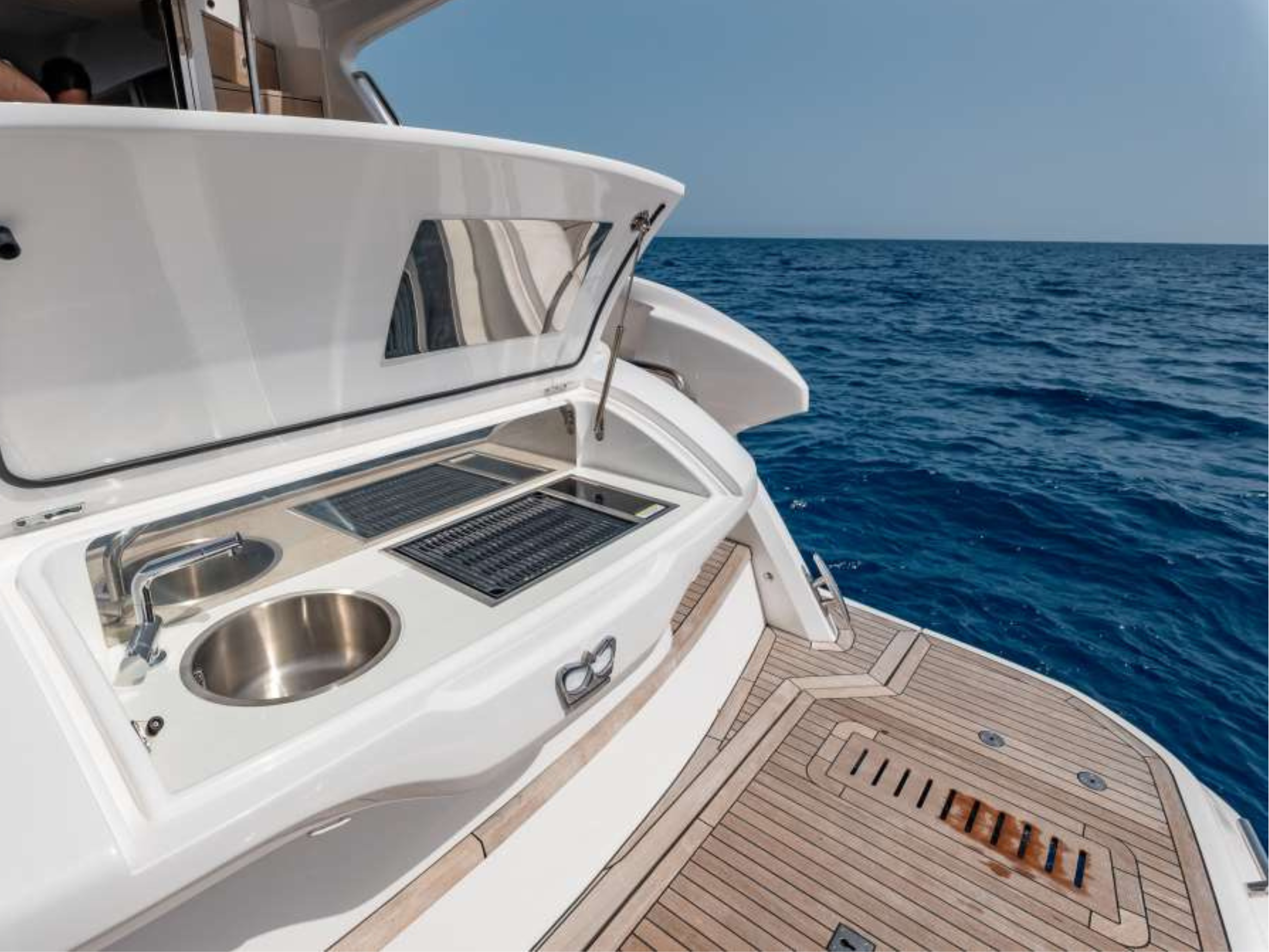 The F45 boasts a spacious flybridge with a BBQ, ideal for entertaining. The interior features a Silver Oak satin finish with walnut flooring, offering a sophisticated ambiance. Advanced features include a Quick Gyro Stabilizer, ONAN 9.5kW generator, Dometic air conditioning/heating system, and a comprehensive Garmin navigation suite. Additional amenities such as underwater lights, a Samsung 40” TV, and a Fusion audio system enhance the onboard experience.