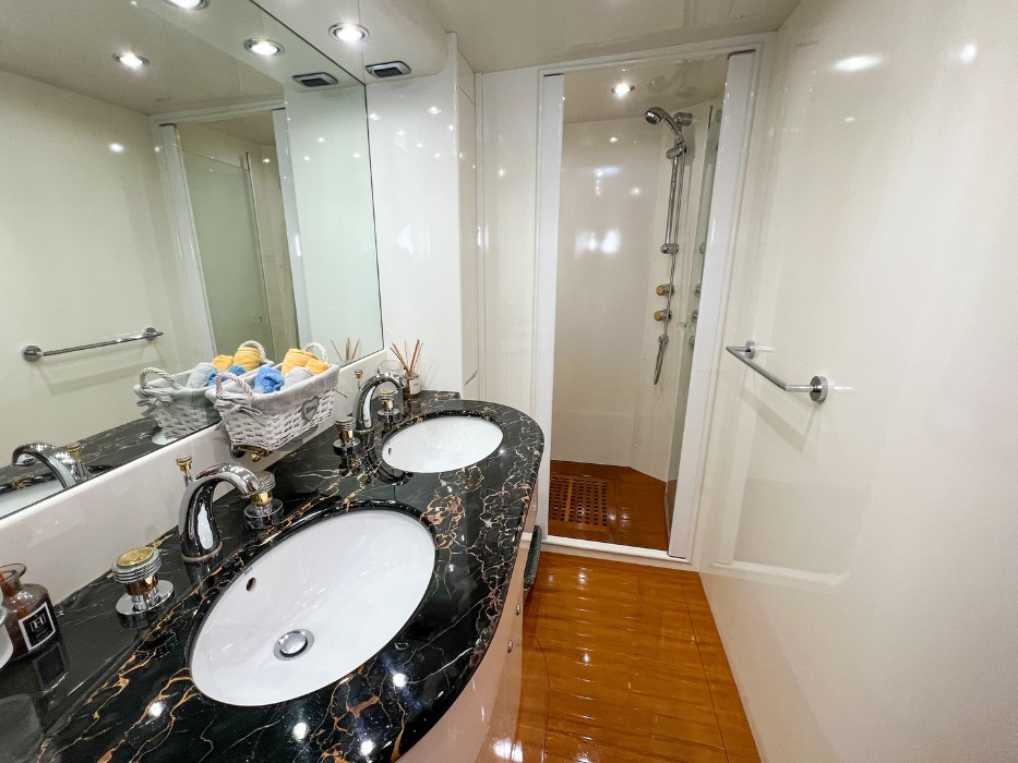 The Falcon 86 accommodates 8 guests in 3 double en-suite cabins and 1 twin cabin. It can host up to 12 passengers on day trips, perfect for sharing precious moments with loved ones. It has a large galley, where an optional chef can prepare gourmet dishes to satisfy discerning palates.