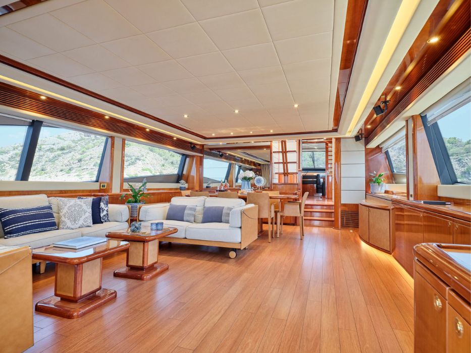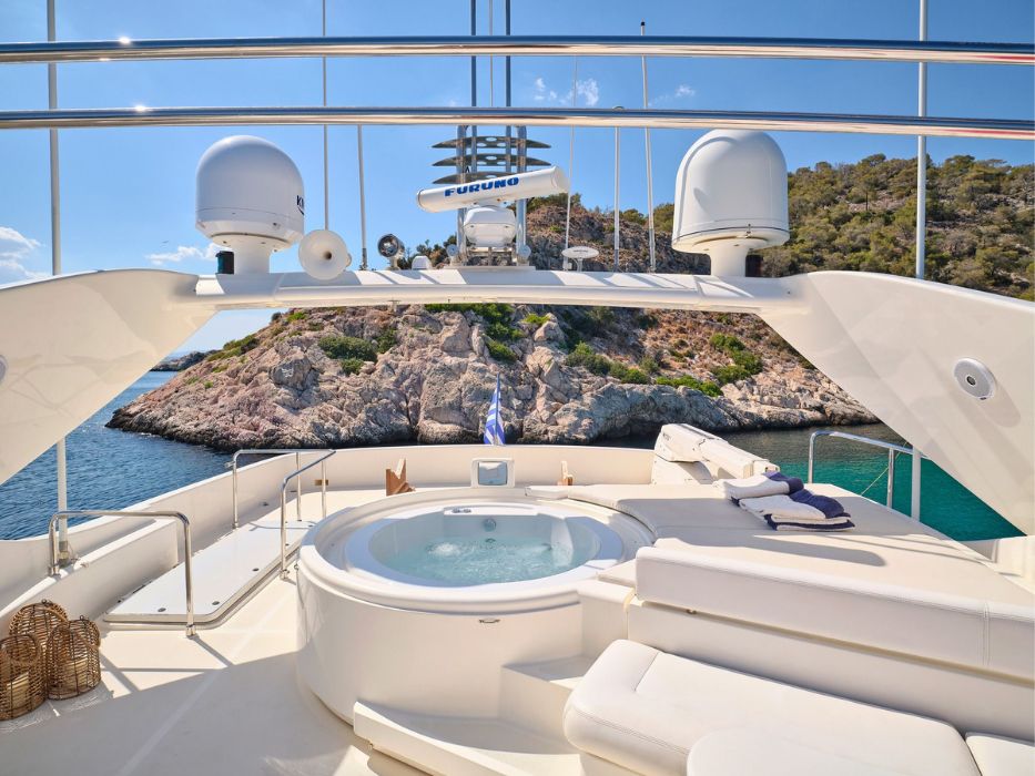 Estia Yi accommodates up to 9 guests in 4 beautifully appointed suites, including a master suite, one double cabin, and two twin cabins. With a professional crew of five on board, guests can enjoy an effortless and indulgent charter experience. Designed for ultimate comfort, the yacht features air conditioning and Wi-Fi connectivity, ensuring a modern and relaxing atmosphere throughout the journey. A standout feature is her inviting deck jacuzzi, perfect for unwinding with a drink in hand while taking in breathtaking views of the Mediterranean.