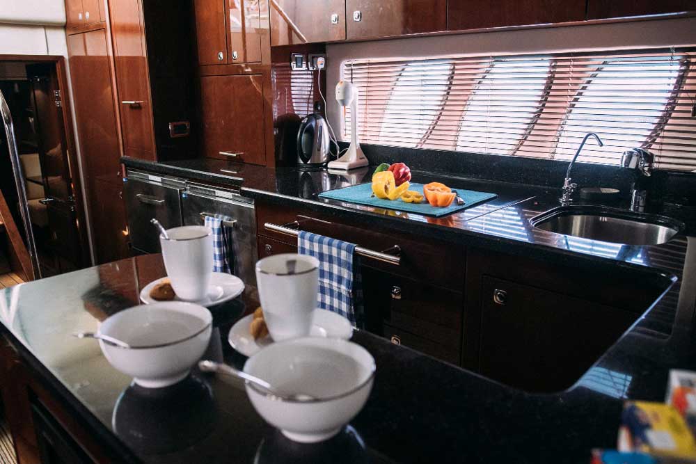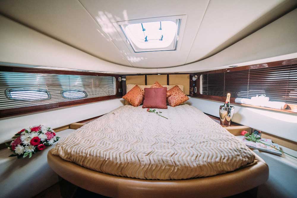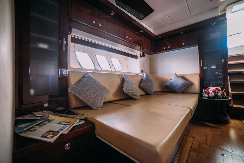 On deck, sweeping seating and a shaded dining area at the stern invite guests to relax, dine or raise a glass while basking in the Mediterranean sun. Generous sunbathing areas on the bow and stern offer both sunny and shaded options, with an onboard sound system to set the mood as you glide past the Blue Lagoon.