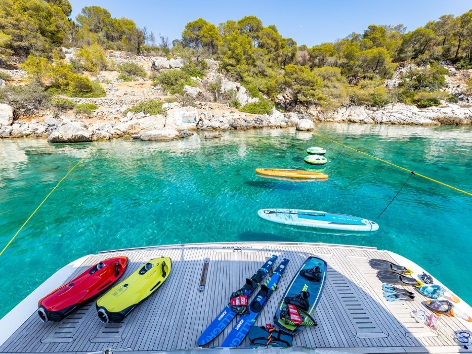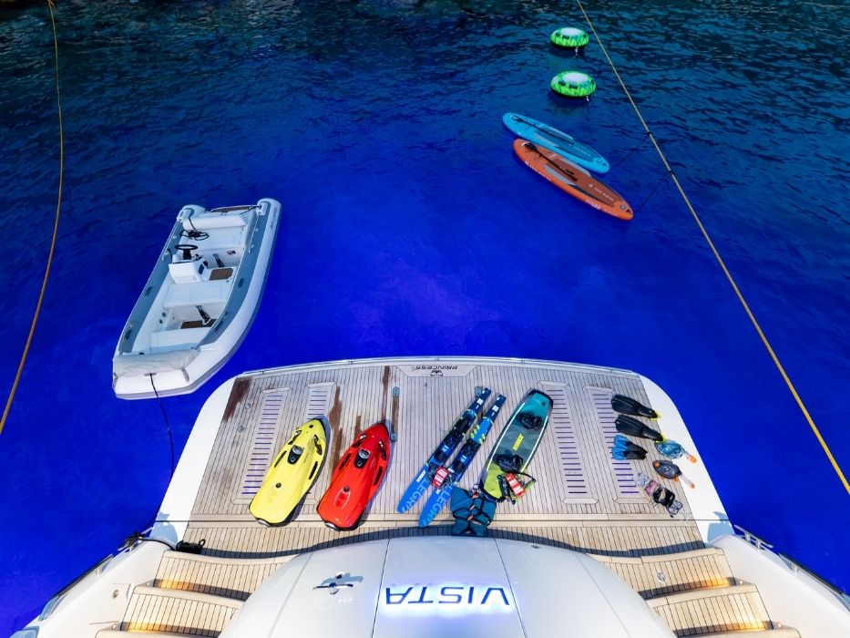 For water enthusiasts, Vista offers an exciting selection of toys and equipment to elevate your time on the water. Glide over the waves with waterskis, explore the underwater world with snorkelling gear, or enjoy the exhilarating freedom of two SEABOBs. For family fun, inflatable water toys and paddleboards add a playful touch. A 4.35m Williams Jet Tender ensures smooth and easy transfers from ship to shore.